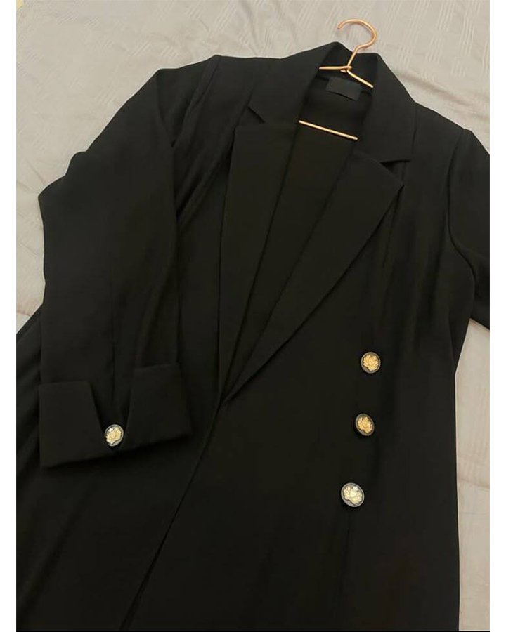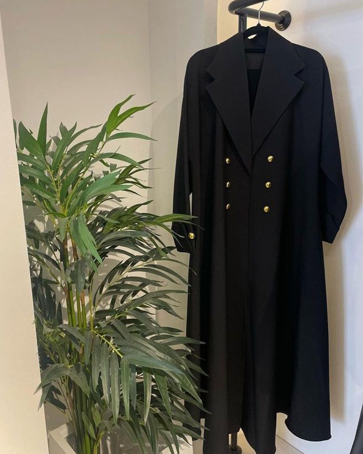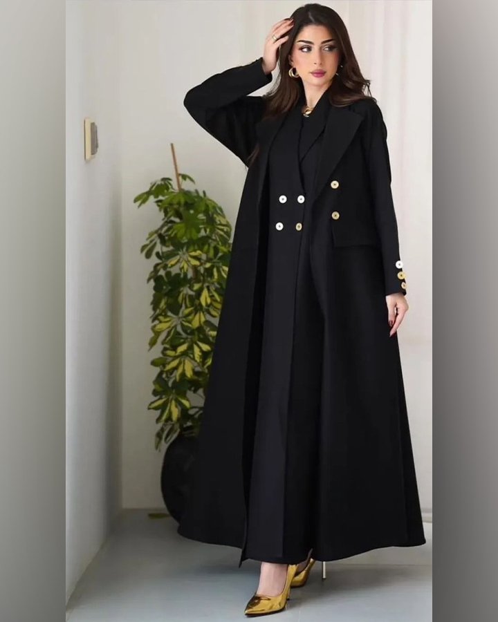 A timeless black abaya featuring a flowy open-front design layered over a tailored double-breasted inner piece. Accented with gold and white statement buttons for a refined touch, this full-length silhouette offers effortless elegance perfect for formal events and sophisticated everyday wear.